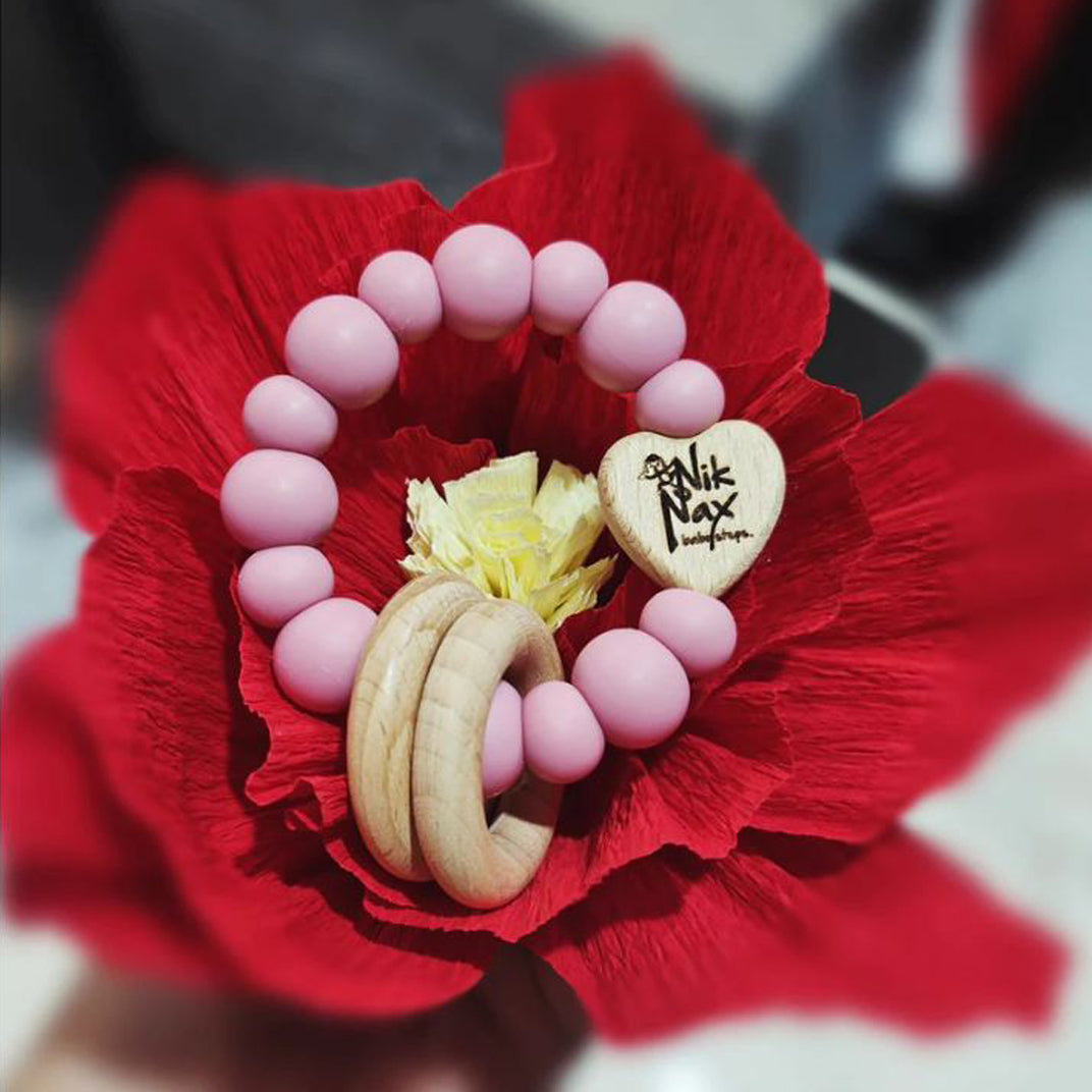 Introducing our handmade Teething Ring. Ideal for massaging sore and swollen gums. This design is in Pink colour tones. This teething ring is BPA Free and suitable for babies 3+ months old. Safety rated AS/NZ. Also available in Blue