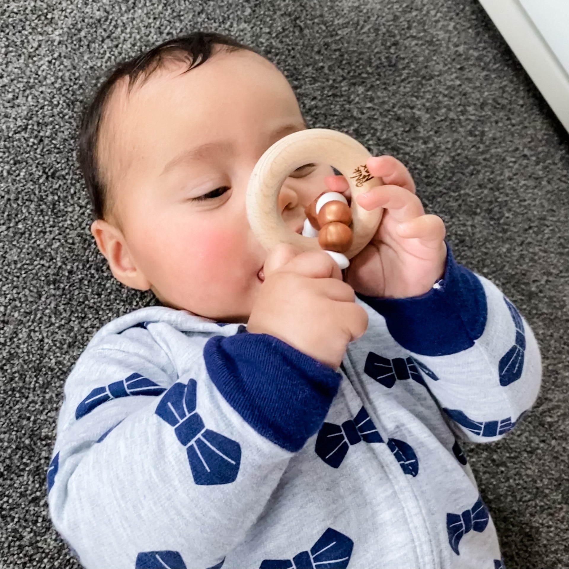 Introducing our handmade Chunky Teething Ring, featuring a Beech wood ring intertwined with a food-grade silicone ring. Ideal for massaging sore and swollen gums, the wood also helps sharp tooth tips to poke through. This design includes Black, Marble and Copper silicone beads in different textures. This teething ring is suitable for babies 3+ months old. Safety rated AS/NZ.